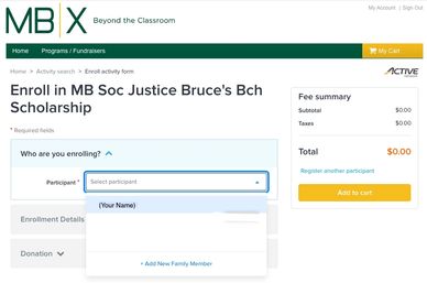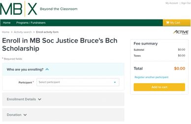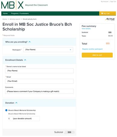 Under Enrollment Details, enter your name, email and leave a comment if you are requesting a Company gift match. Under Donation, check the box to select the Bruce's Beach Memorial Scholarship and then enter your donation amount. Click Add to Cart.